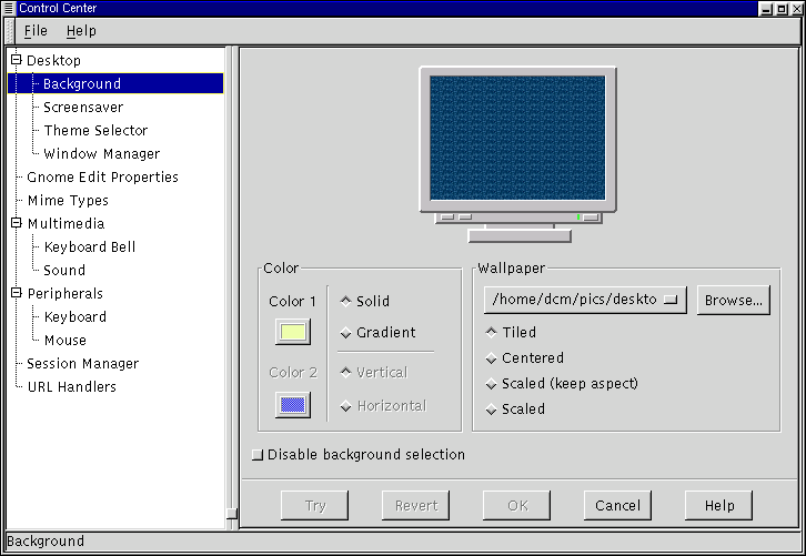 If you decide to have an image as wallpaper you may browse for the image you wish to use. Once you have found your image you need to decide whether you would like to have the image tiled across the screen, centered, scaled up while keeping the same aspect, or simply scaled up to fit the screen. Once you have changed your background properties you may press the Try button at the bottom of the Control Center to make the change.