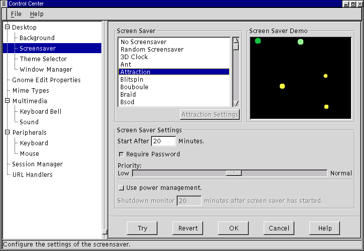 In this capplet you can change your xscreensaver properties. This capplet contains a list of available screen savers you may choose and a demo screen. Below these two dialogs you will see a set of tools that allow you to change the settings for the global screen saver properties. If the screen saver you choose has particular settings you can change those by pressing the Settings button that appears below the Screen Saver list.