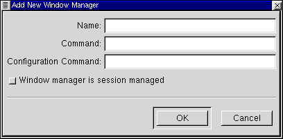 In the Add New Window Manager dialog you may specify the name you wish to give the window manager, the command to launch that window manager, and the command to launch any configuration tool that might be available for that window manager.