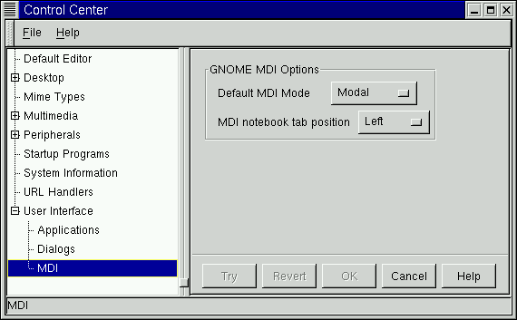 The MDI capplet allows you to change the MDI mode for GNOME applications. MDI stands for Multiple Document Interface and refers to the how more than one document is displayed in GNOME applications.